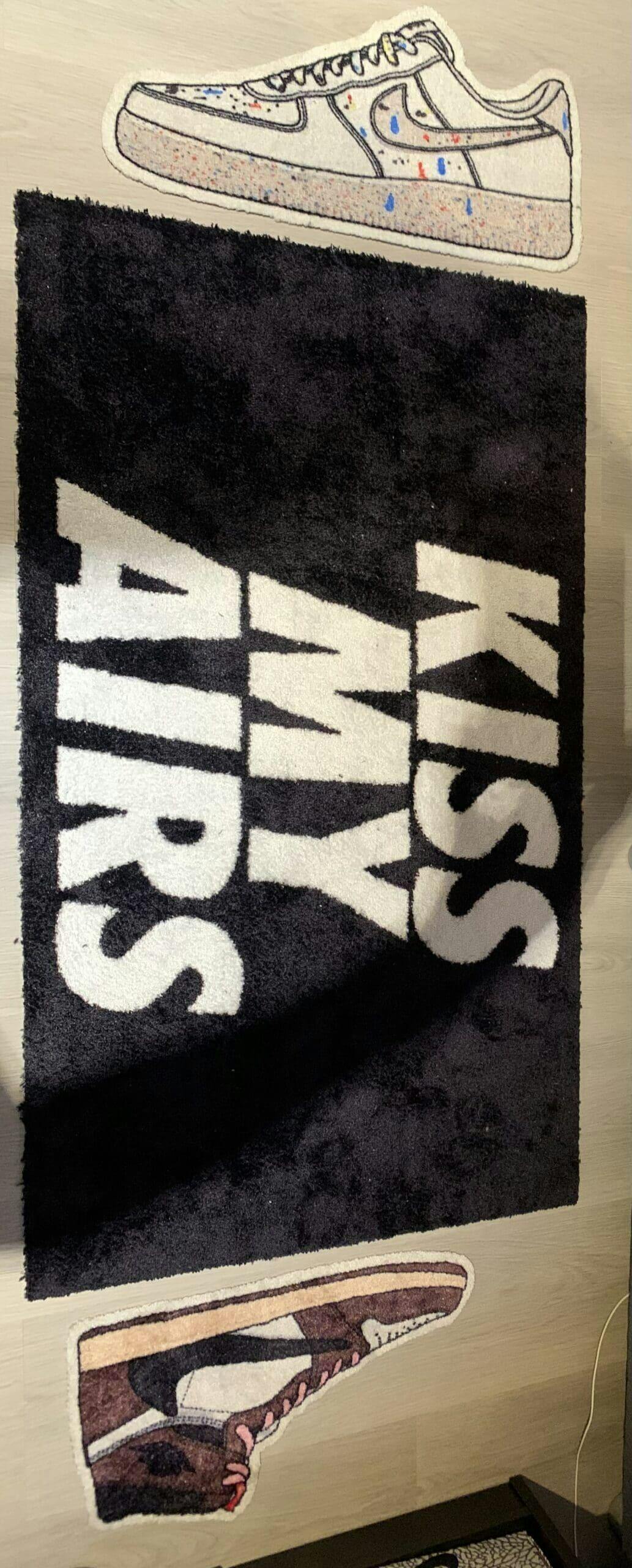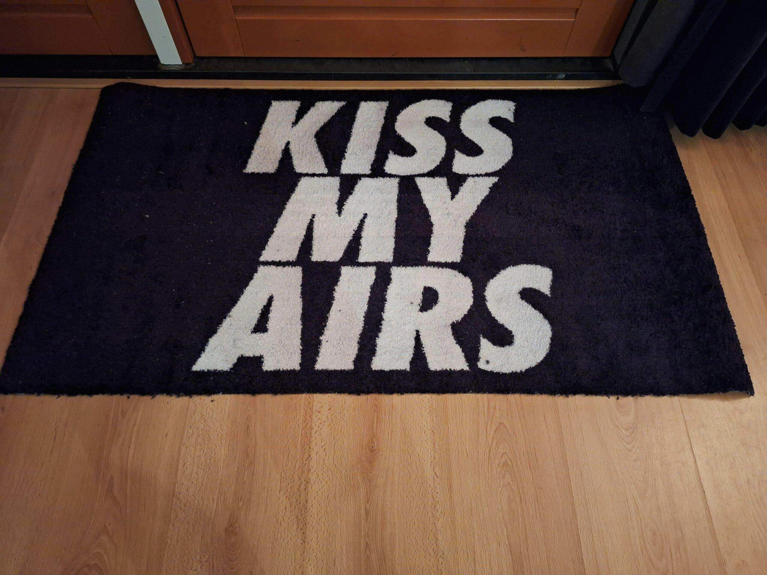KISS MY AIRS! als het maar duidelijk is. Dit is het vloerkleed die elke Air Max liefhebber hoort te hebben. Het vloerkleed is in 2 formaten beschikbaar en kan als schoonloopmat maar ook als tapijtje in je sneaker-, game, werk- of slaapkamer gebruikt worden!